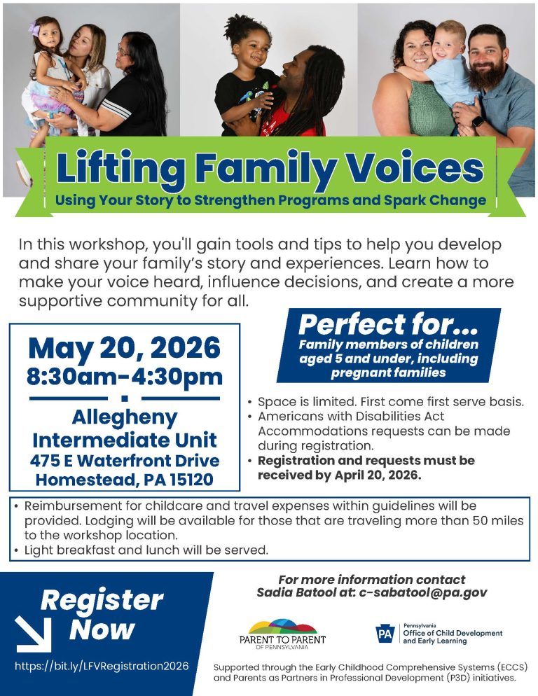 In this workshop, you’ll gain tools and tips to help you develop and share your family’s story and experiences. Learn how to make your voice heard, influence decisions, and create a more supportive community for all. See the flyer for more information and the registration link.